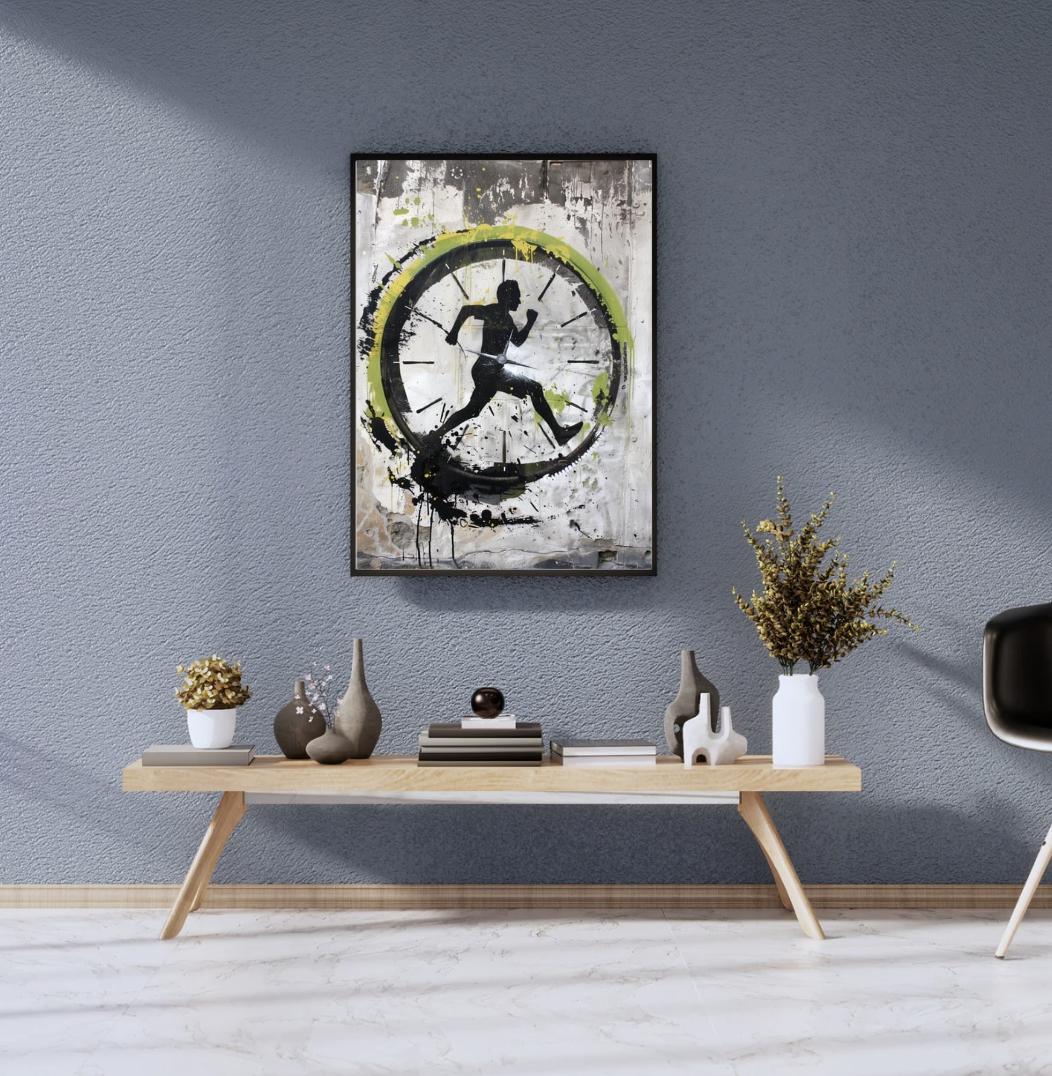 The Endless Run captures the relentless pursuit of time, ambition, and progress through a bold and minimalist urban composition. A solitary figure runs within a fragmented circular form — a subtle metaphor for the constant race between time and success.
